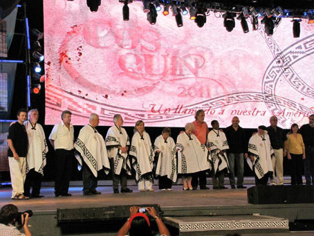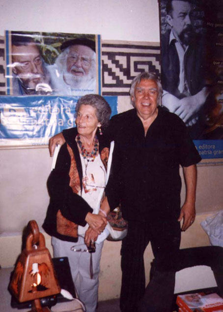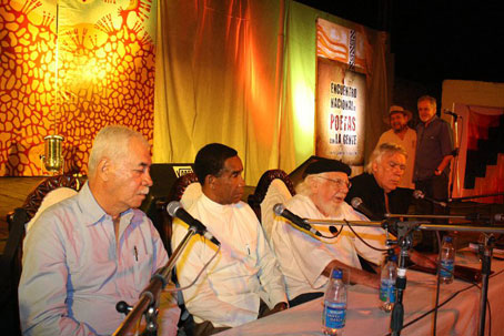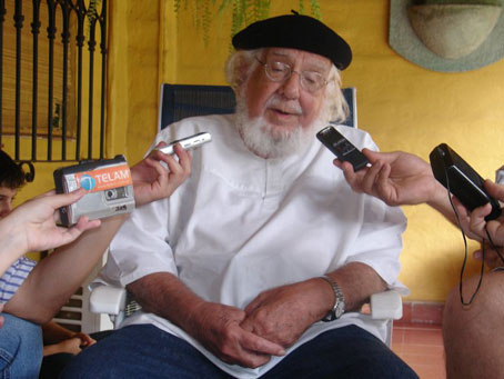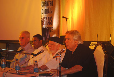 Ernesto Cardenal desgrana las negras letras de los versos del Cántico Cósmico, flanqueado por el documentalista hispano-argentino radicado en México, Modesto López (der.), el poeta ecuatoriano Antonio Preciado Bedoya, primer Ministro de Cultura del gobierno de Rafael Correa y actual embajador de su país en Nicaragua, y por William Agudelo, poeta de Colombia, cofundador junto al poeta nicaragüense de la Comunidad de Solentiname (izq.). Detrás, sus presentadores: los poetas Miguel Vera y Jorge Boccanera.
